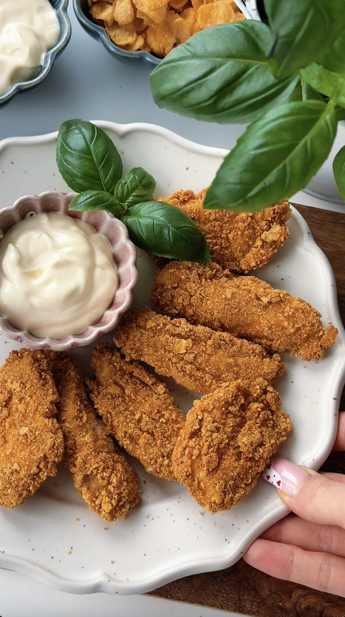 3. Corn Flakes zmiksuj na mąkę lub rozgnieć. Kawałki kurczaka maczaj w masie i w Corn Flakes, a następnie kładź na blaszce.