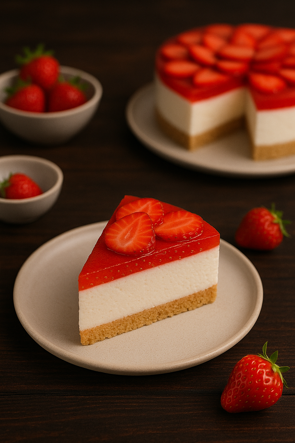 • Pokrojone truskawki ułóż na stężonej masie serowej. Wylej galaretkę i odstaw do lodówki na kilka godzin aż całość dobrze stężeje.