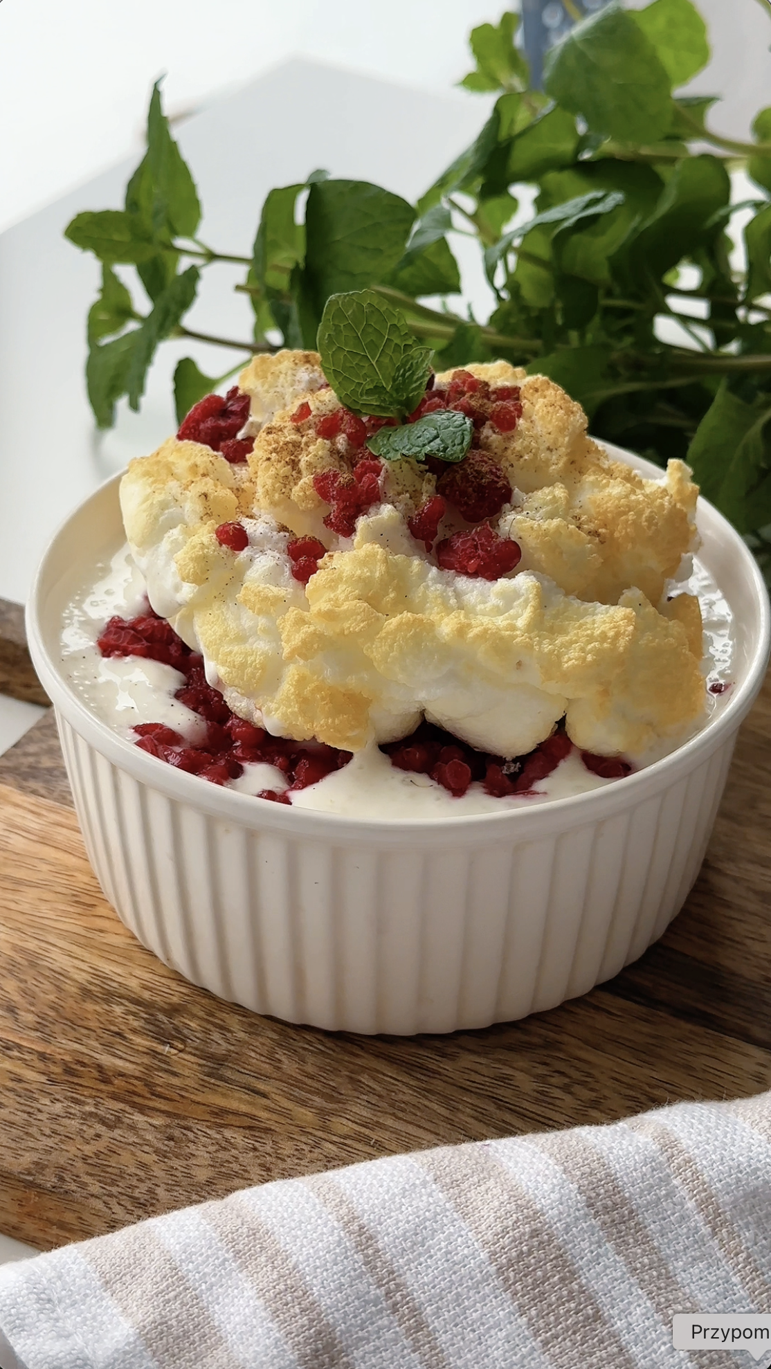 8. Gotową wystudzoną bezę wykładamy na wierzch naczynia z jednoporcjowym.
