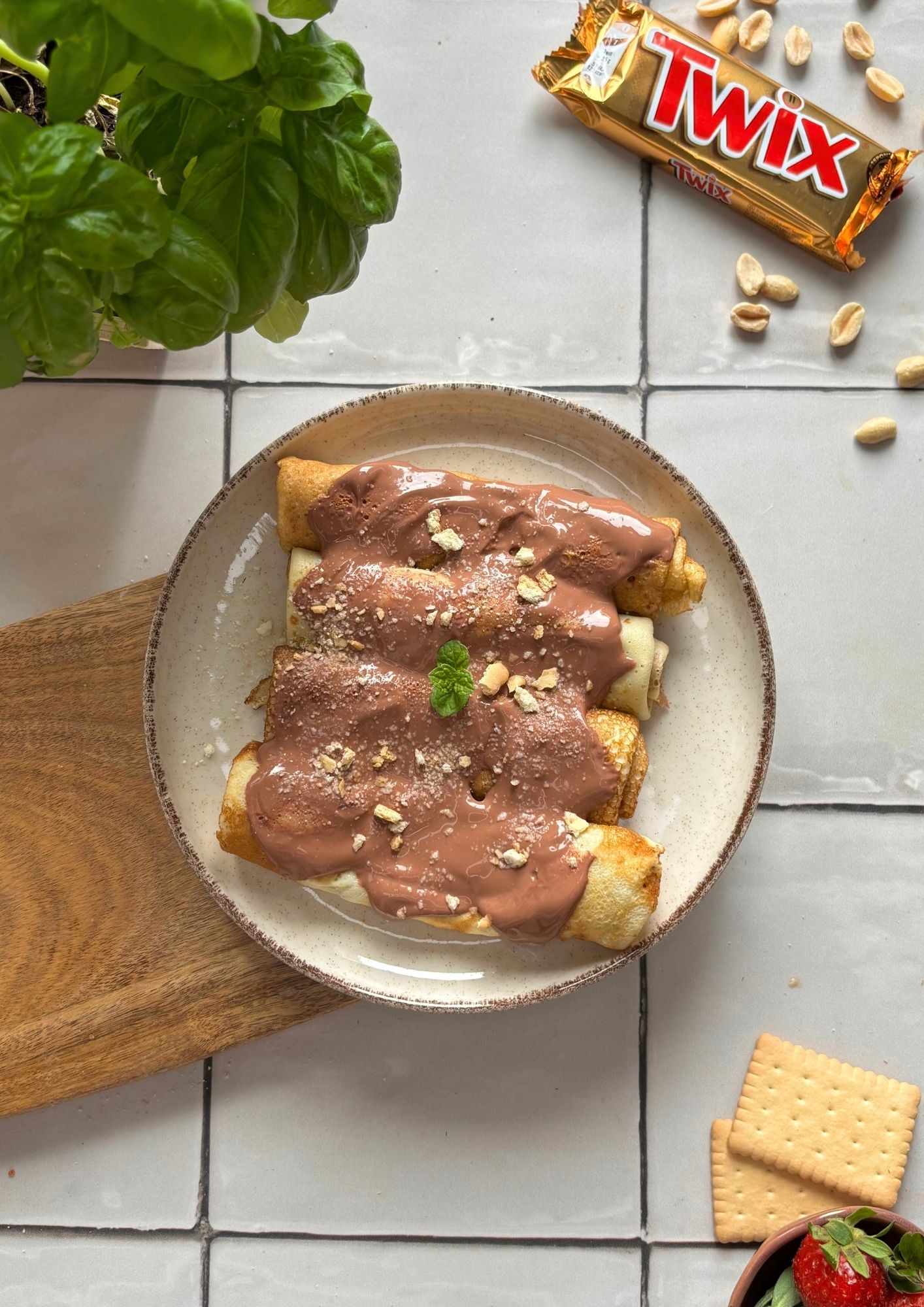 - Posmaruj naleśniki karmelem, posyp pokruszonym herbatnikiem, zwiń, polej polewą.